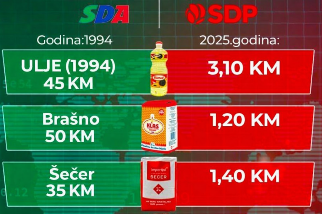 Razlike u cijenama osnovnih životnih namirnica između ratne 1992. i današnje 2025. godine najbolje pokazuju kako se mijenjao odnos države i građana prema samoj ideji prehrane. U ratu, pod upravom SDA, hljeb je bio simbol opstanka – nije se mjerio u novcu nego u vezama, hrabrosti i sreći da ga uopće pronađeš. Ulje i šećer nisu bili artikli, nego valuta, predmet razmjene i mita. Ljudi su živjeli u ekonomiji improvizacije, gdje se vrijednost mjerila u mogućnosti da se preživi još jedan dan.